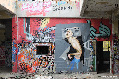 I come to this place often to take pictures and explore the changing pattern of decay and graffiti over time. This is an active location year round. When things get too cold outside writers hit the walls up during the winter. In fact, all throughout the year writers paint in the factory. You can always find something new on the walls when you visit. Since its abandonment some time ago (even this I am not sure of) this building has become an important part of the TA Wall area and a popular spot to paint. Although I have many, many pics from over the last few years of the factory, I've got my latest shots from the 21st of October posted here when I was last checking up on the TA Wall area.